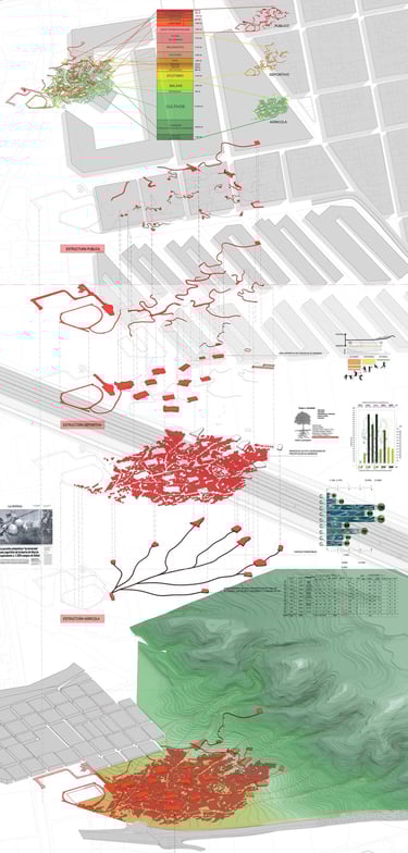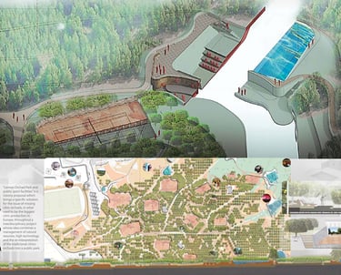 The project was conceived as a living organism rooted in the cycle of water. Every path, basin, and plantation line derived from the natural slope of the terrain. Instead of treating the orchard as obsolete land waiting to be urbanized, the proposal reimagined it as a hybrid infrastructure: