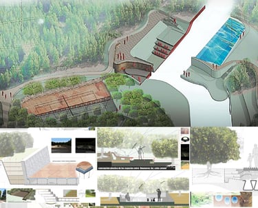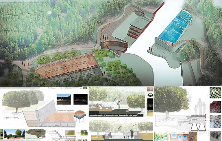 The design process began with fieldwork: mapping slopes, measuring rainfall, and identifying zones suitable for water retention. A detailed pluviometric study guided the placement of accumulation basins, capable of storing stormwater during the rainy season and holding other uses, an outdoor cinema or recreation areas during the dry months.