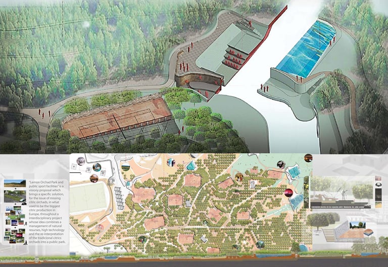 The result was The Lemon tree park, a vision for a productive public landscape where orchards, sport, and community life could coexist through an intelligent management of water, climate and topography.